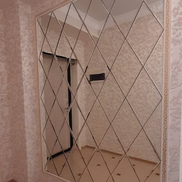 Использовалась серебристая зеркальная плитка формы "вытянутый ромб".