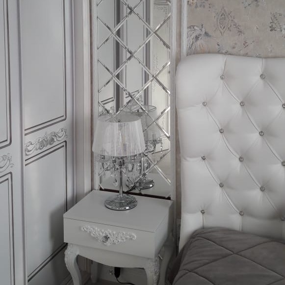 В этой воздушной спальне панно не только украшает простенок, но и добавляет света в этот уголок, а также зрительно расширяет узкое пространство между кроватью и гардеробом. В вечернее время зеркало будет отражать настольную лампу, рассыпать блики и усиливать игру света с помощью ее хрустальных подвесок.